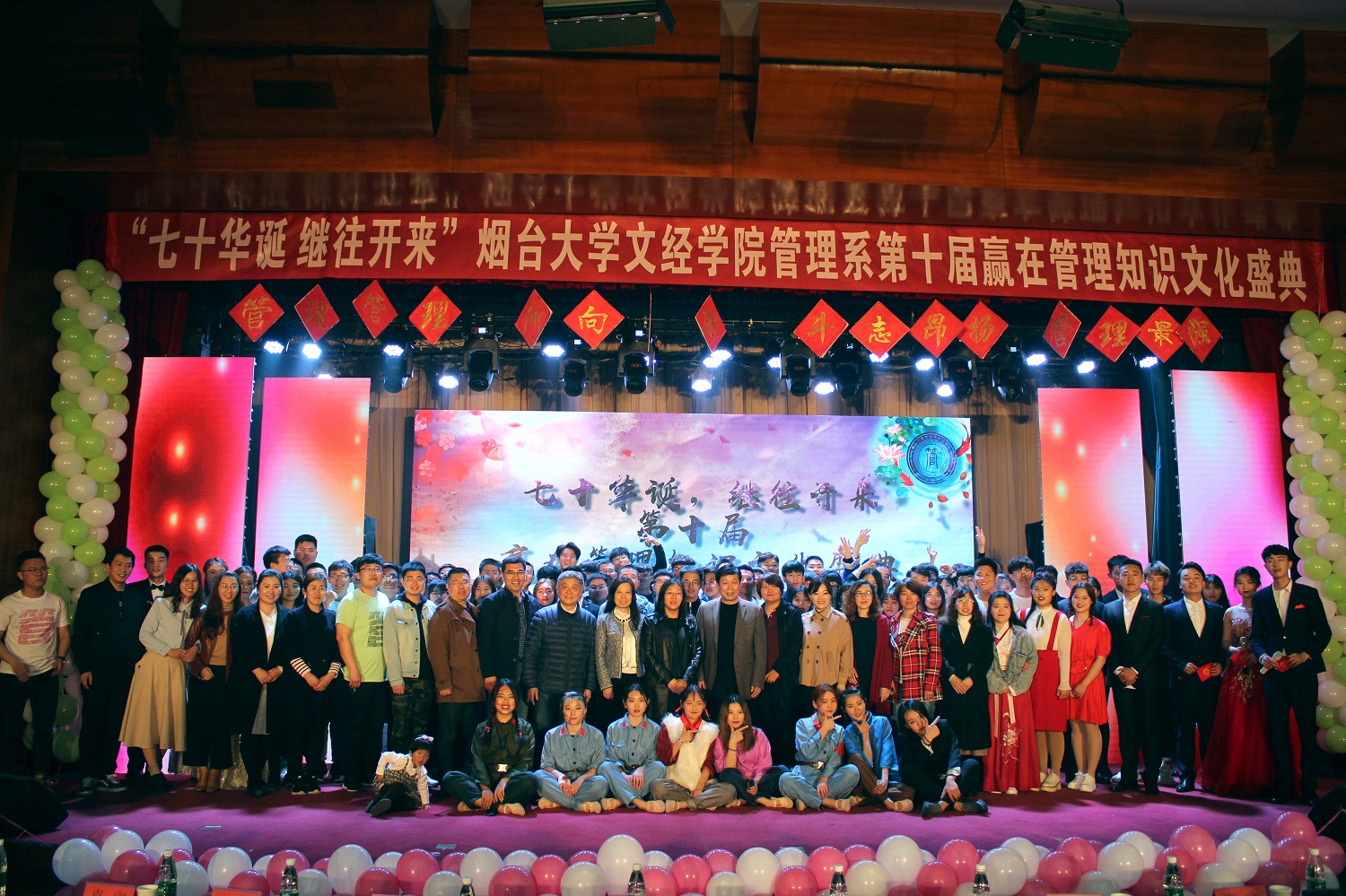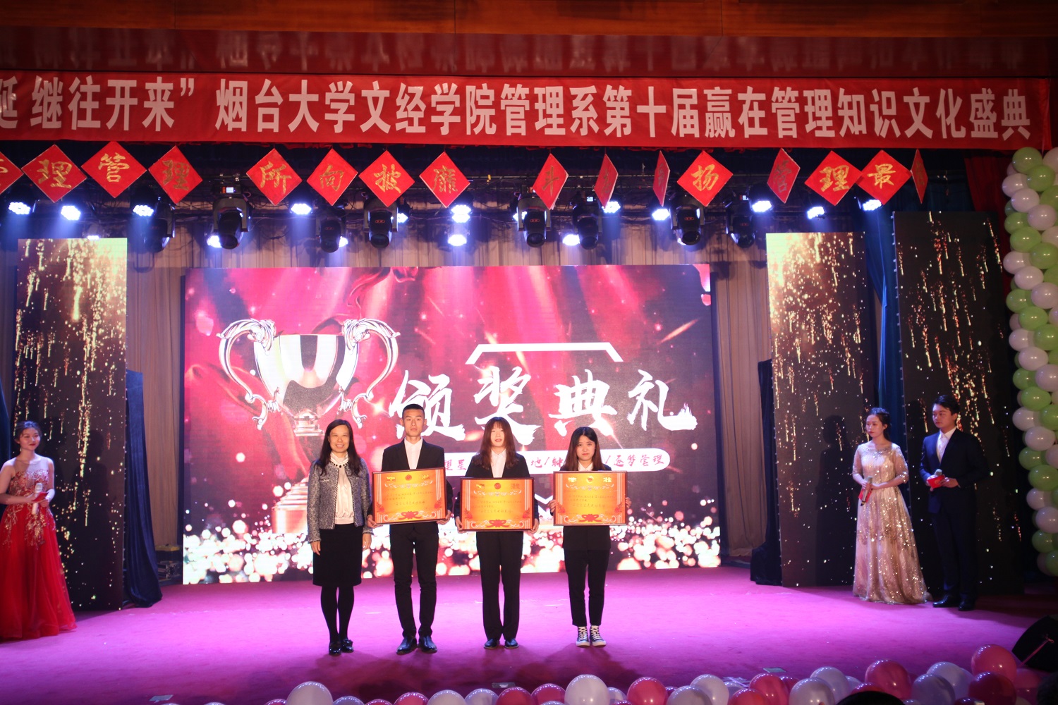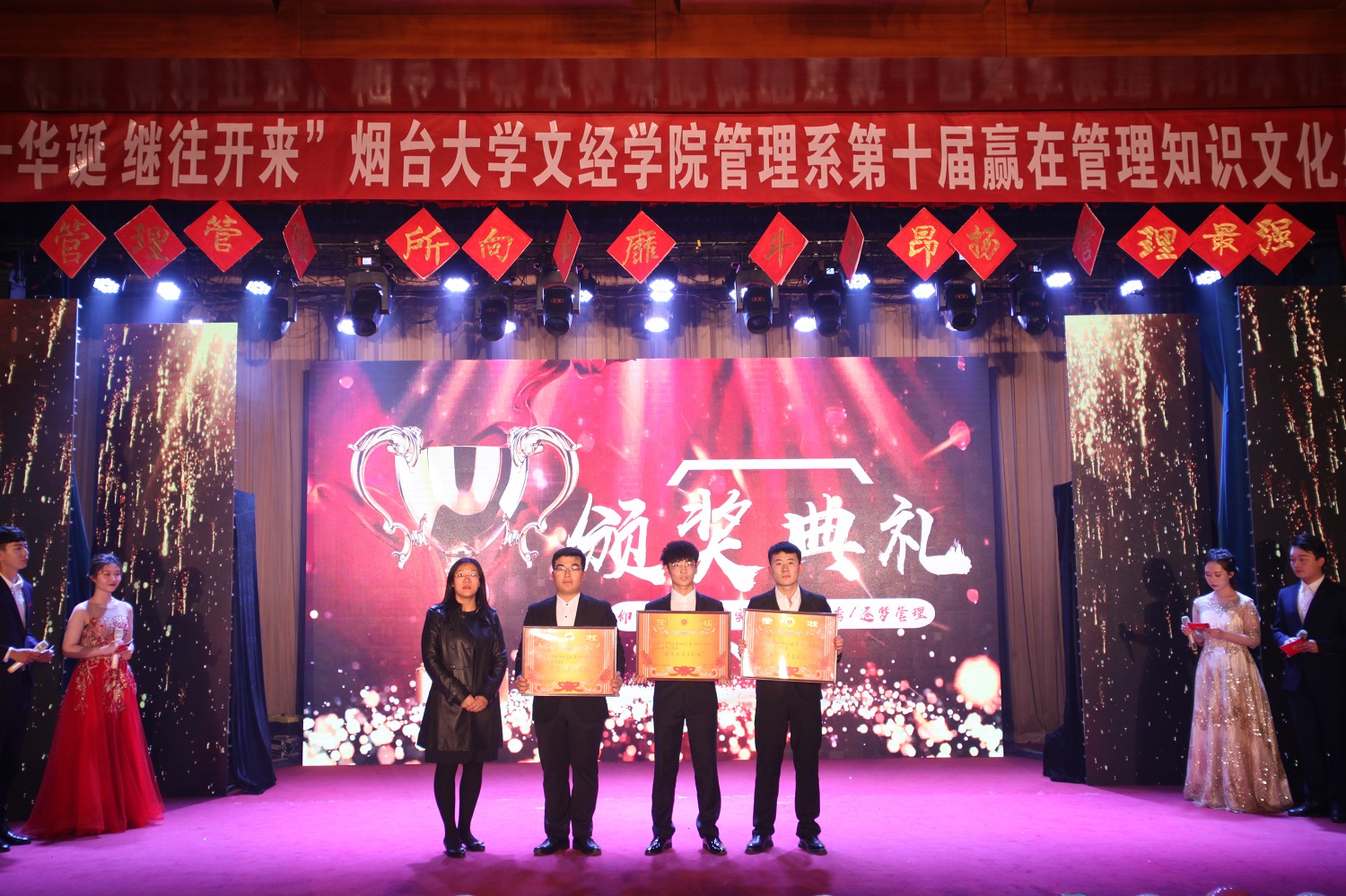 4月24日晚,管理系于一教多功能举办第十届赢在管理知识文化盛典,学院党委副书记李荣梅、院长助理莫红菊、学院管理总督导杜希成、学院工会主席史毅、组宣部部长张琼玉、学工部部长杜娟、招生就业部部长李洁、院团委书记毕海平、信息系党总支副书记申海滨、管理系党总支书记邓之增、副主任王燕、各系团总支书记及管理系全体教师及学生代表共同参加活动。
