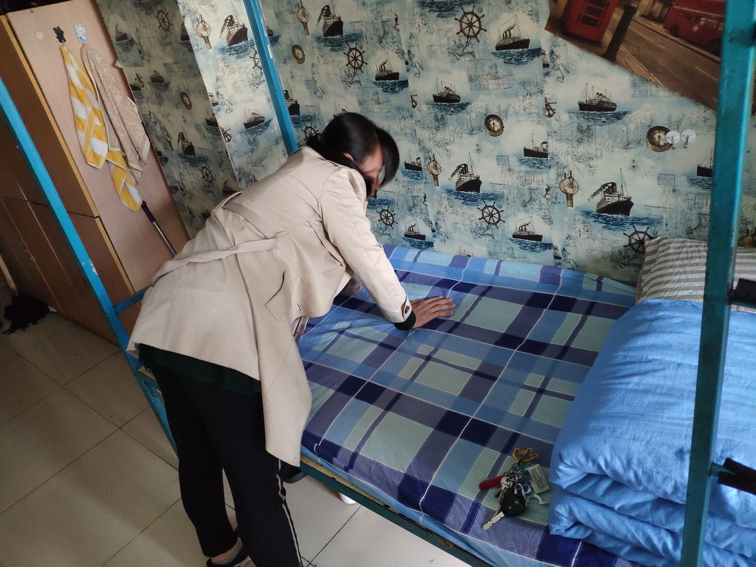 本次现场办公会议分为安全督查和文化指导。首先,在走访过程中对学生宿舍安全、文化、舒适度、满意度等方面进行随机调研,了解学生对于社区的真实想法。其次,对学生开展社区安全主题教育,倡导积极构建安全宿舍、文化宿舍、舒适宿舍,并由辅导员、班主任老师进行现场内务整理示范。最后,重点进行社区安全检查,主要排查是否违规使用大功率电器、是否存在违规用电等问题。经走访排查发现大多数宿舍内务整洁、用电合理。老师对内务优秀宿舍提出表扬,并鼓励学生继续保持良好的行为习惯,对于少部分杂物堆放较多、异味宿舍,进行现场指导并展开安全教育的普及,提出具体整改要求。
