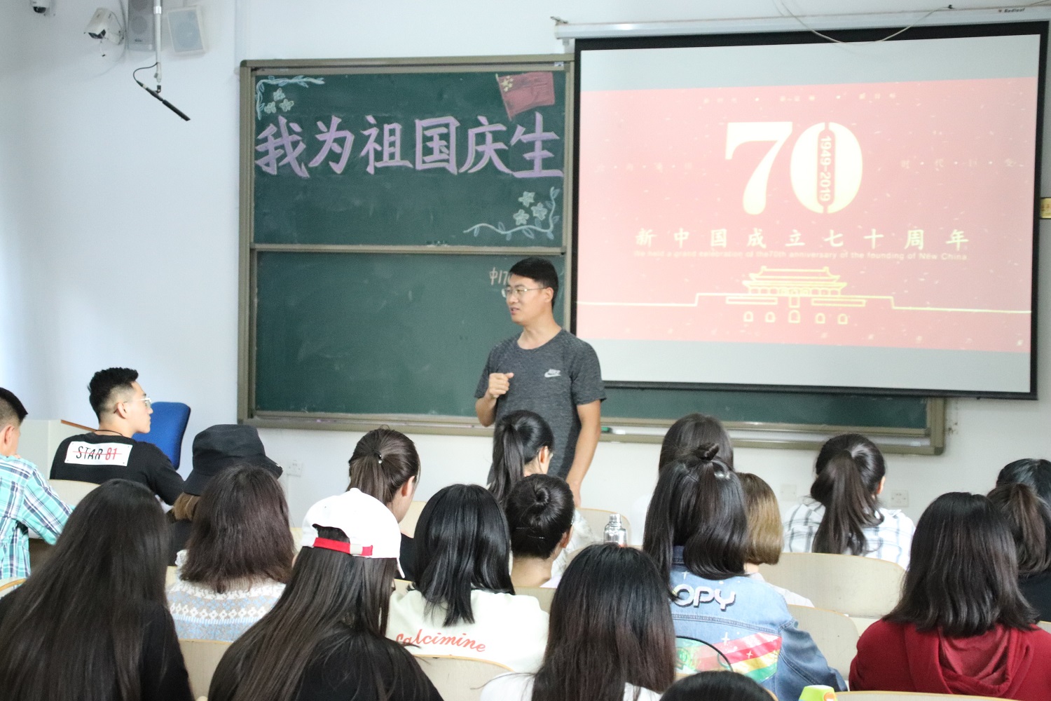 为献礼祖国70周年华诞,培养学生的爱国情怀,9月27日,中1701-1班于一教119召开“我为祖国庆生”主题班会,中文与法律系党总支书记、班主任曹钊庆出席,全体同学参加了此次班会。