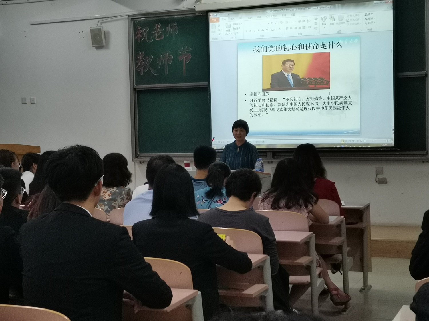 讲座伊始,党总支副书记申海滨对全体教师祝以节日问候,她强调,在教师节当天开展“不忘初心、牢记使命”主题教育,希望全体教师以立德树人为根本任务,深入学习习总书记重要讲话精神,深刻领会开展主题教育的重大意义。随后,赵文静教授以“不忘初心、牢记使命的思想基础,历史逻辑与时代意义”为题展开交流。她说,十九大是中国共产党的政治宣言,是举旗定向、引领复兴、兴党强国、具有强烈使命感的好报告,我们要用党的创新理论武装头脑,推动全党更加自觉地为实现新时代党的历史使命不懈奋斗。她指出,世界上没有一个政党能像中国共产党这样将为人民中的幸福着想,中国共产党人的初心和使命就是为人民谋幸福,为民族谋复兴,是实现伟大复兴的中国梦。正如总书记所说,实现中华民族伟大复兴,绝不是轻轻松松、敲锣打鼓就能实现的。全党必须付出更为艰巨、更为艰苦的努力。在回顾中国共产党的党史历程中,她说,中国的昨天是“雄关漫道真如铁”,今天我们党面对四大考验和四大危险依然坚定步伐,可谓“人间正道是沧桑”,面对世界格局变化,我们党在初心使命的召唤下,以“刮骨疗毒”的勇气乘风破浪持续推进伟大的自我革命。在新时代的长征路上,我们要跨越和征服新的“雪山”“草地”“娄山关”愈是艰难,我们愈加坚定。