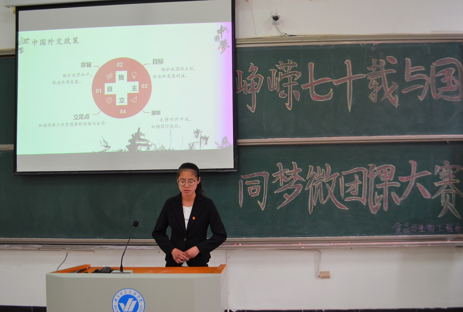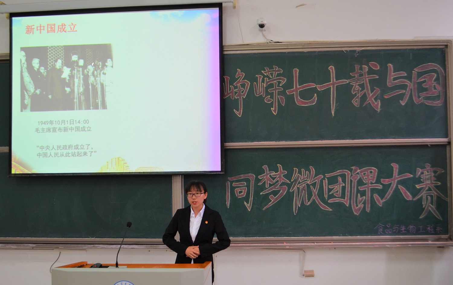 为更好的践行社会主义核心价值观,弘扬青年团员爱国主义精神,5月24日下午四点,食品系于二教111教室举办“峥嵘七十载,与国同梦”微团课大赛。食品系党总支书记王少辉,团总支书记王晶,团总支学生副书记卢铭源,学生会主席张慧琳,团总支各部长及学生会主席团代表参加此次活动。