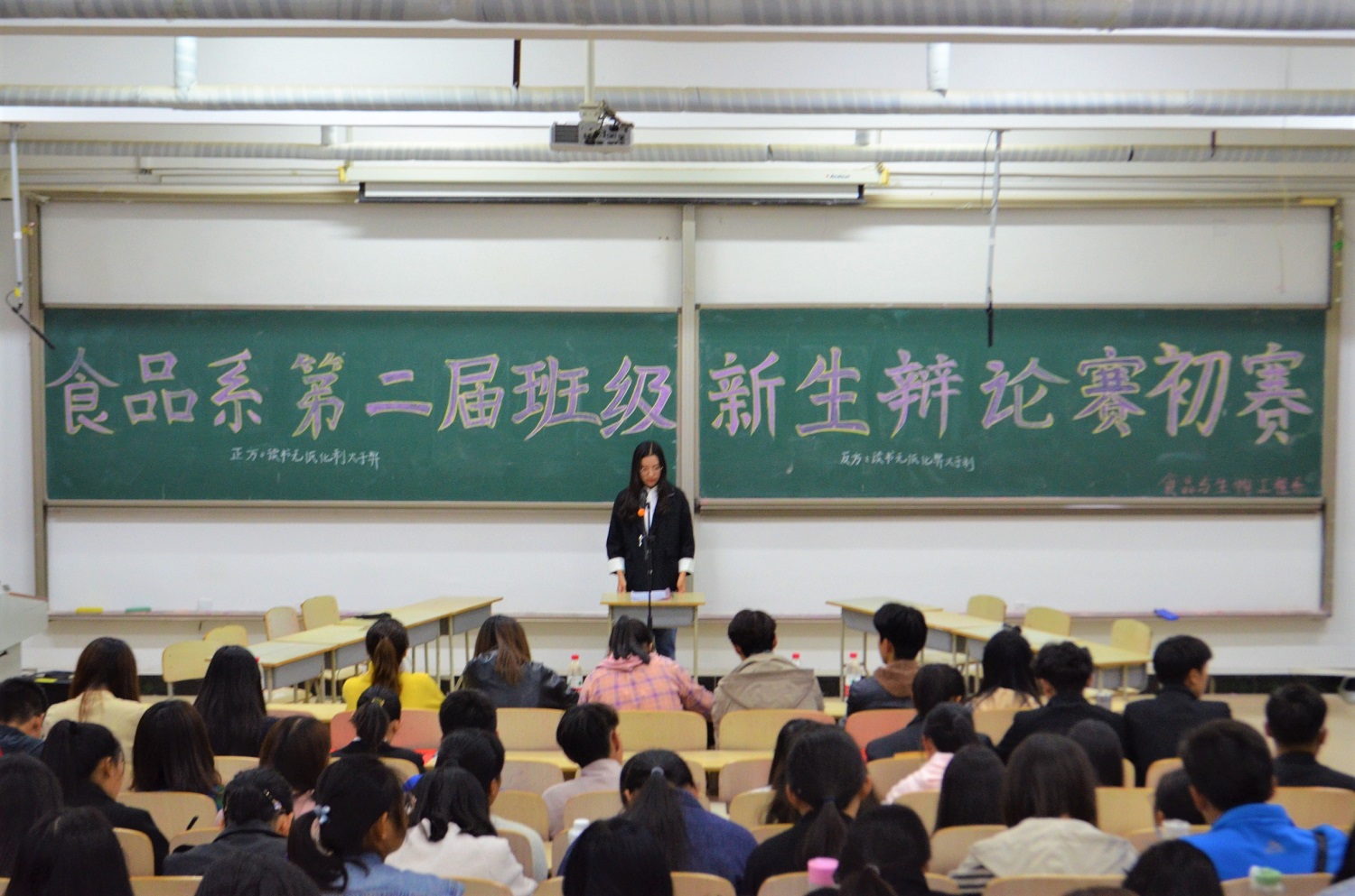 为提高学生的思辨能力和语言表达能力,培养团队意识与创新意识,10月20日晚,食品系于一教103教室举办第二届班级新生辩论赛初赛。特邀外语系辩论队队长吕明洋到场观看,食品系学生会副主席马宏宇,辩论队队长陈宣合、陈汝君及大一全体学生参加。