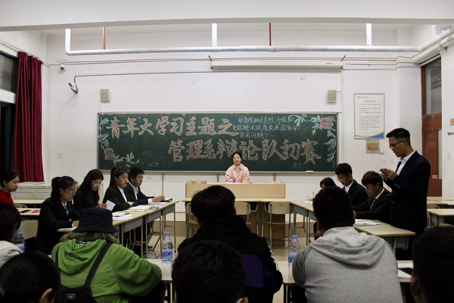 为深入学习贯彻习近平新时代中国特色社会主义思想和党的十九大精神,引导青年学生培育和践行社会主义核心价值观。10月19日晚,管理系于一教217、218举行了以“青年大学习”为主题的辩论赛。