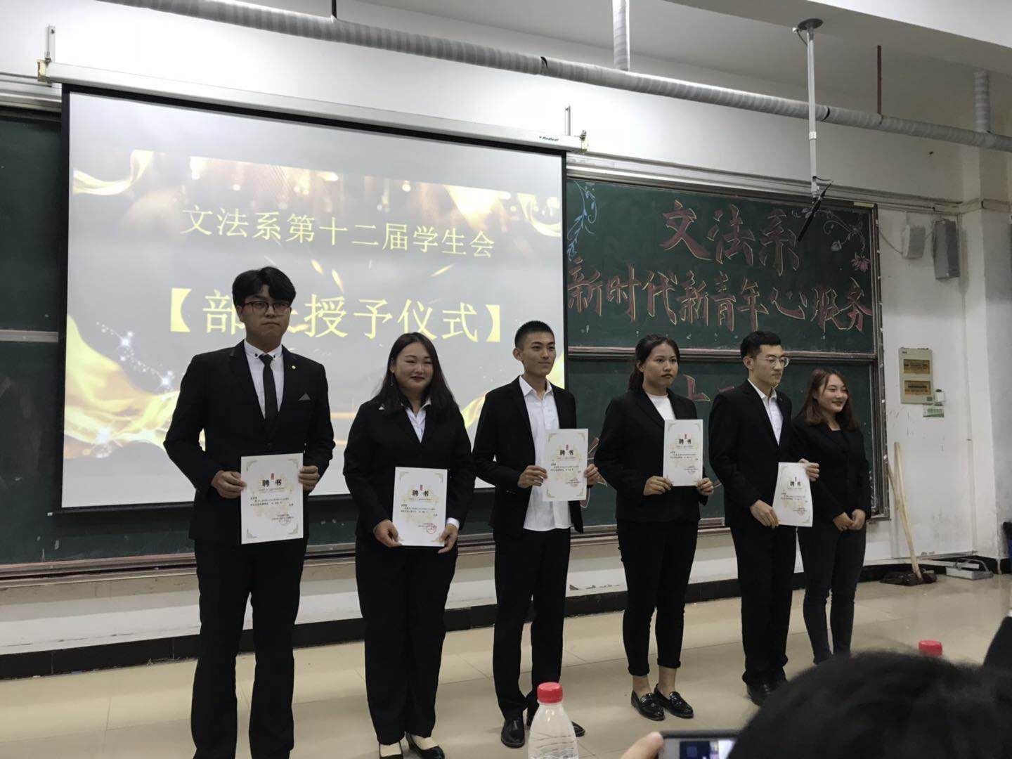 本次活动共分为“回顾·成长”和“展望·起航”两个篇章,团总支书记陈秀慧老师发表了动员讲话,她全面地阐述了本次培训班的目的和意义,希望学生干部能明确自身位置,树立服务意识,增强责任感。学生会主席张庆旭总结了过去一年的学生会工作并进行了成果展示,团总支学生副书记唐梦雪在会上带领大家详细地学习了《以新作为担当使命,做新时代青年干部》的主要内容。同时,在会上进行了文法系学生会第十二届主席团和部长的授予仪式。学生会常务副主席穆晓钶带领全体学生干部进行了宣誓。最后,陈秀慧老师进行了总结发言,她首先表达了对前任学生干部团队的肯定和感谢,向新成员给予了希冀与鞭策,要求新一届成员秉承学生会宗旨,摒弃庸俗作风,营造平等氛围,扎扎实实做事,并祝愿所有学生干部在本次培训班收获最好的自己。