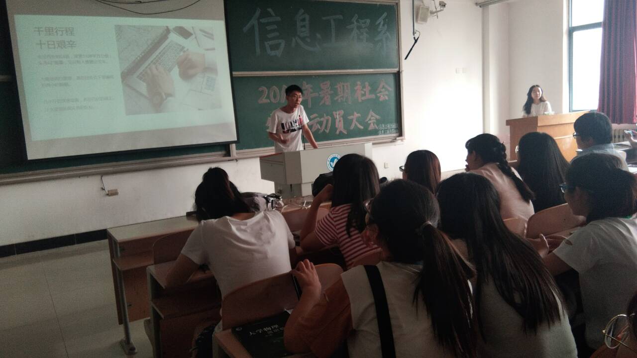 刘一鸣、刘肖麟、李志祥三位学长给同学们介绍了暑期社会实践的内容和他们在往期社会实践中的收获,用灵活的语言煽动着在场的每一个同学。2018年暑期社会实践分为五个专题:学习总书记讲话,做合格共青团员;强化理论学习,坚定理想信念;关注国计民生,弘扬志愿精神;推进社会调查,积极建言献计和关注创新创业,推进新旧动能转换。除以上五个专题内容外,根据团中央、团省委的通知内容,2018年暑期社会实践活动还将联合有关方面,实施大学生暑期社会实践专项工作。为全面建成小康社会贡献青春力量,以优异成绩庆祝十九大与两会的圆满结束,我系以实际行动践行社会主义核心价值观,贯彻十九大精神。