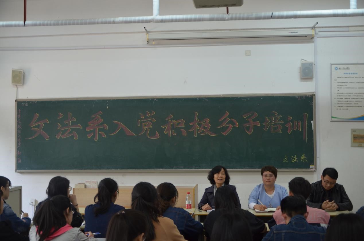 为扎实推进“两学一做”学习教育常态化制度化,4月19日,文法系第一期入党积极分子培训启动大会于一教214举行,文法系党支部书记王淑霞、党支部副书记曹钊庆、团总支书记陈秀慧出席,文法系入党积极分子参加。