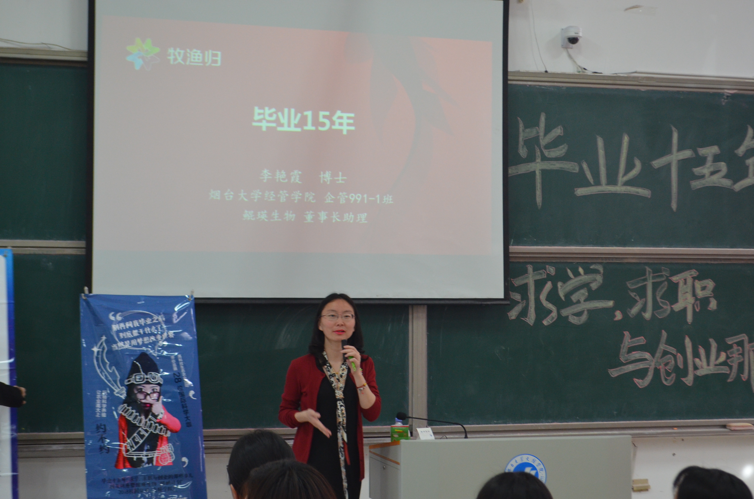 4月11日下午,烟台大学经管学院99级本科生、复旦大学管理学博士、鲲瑛生物科技有限公司联合创始人李艳霞于二教111为文经学子带来创业指导专题讲座,近二百名学子到场聆听。