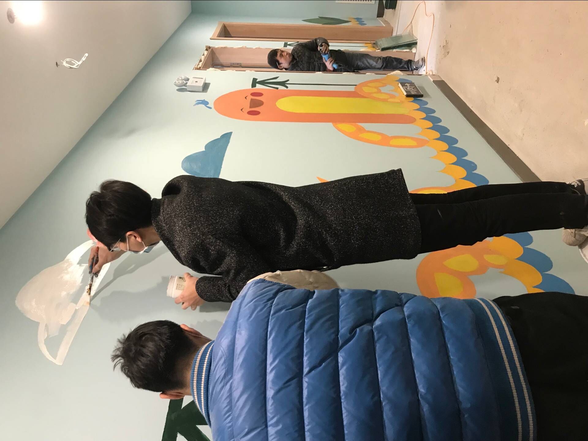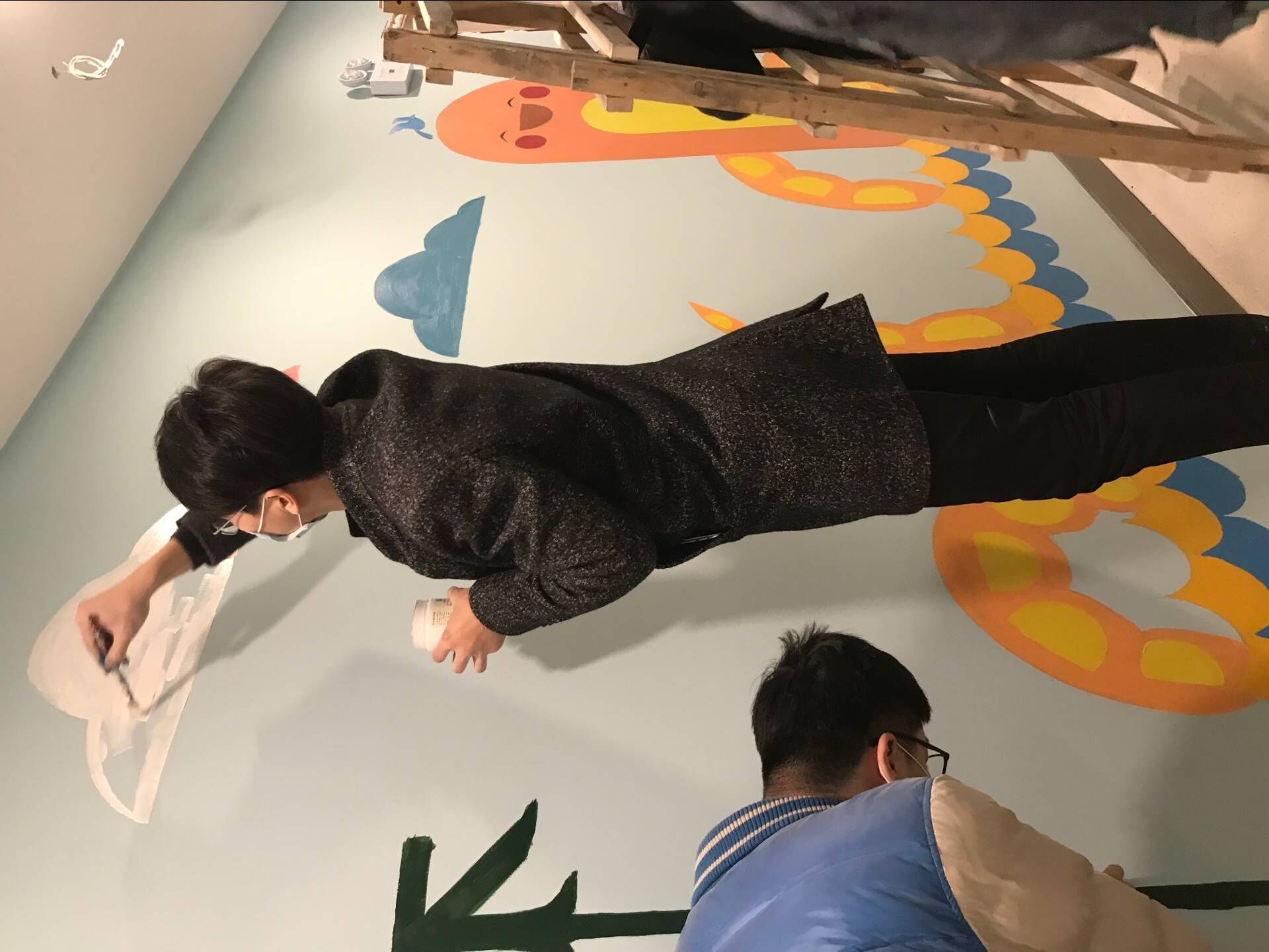 在活动前期,同学们精心准备,到绘画地点精确测量,与幼儿园相关负责人讨论制定绘画方案并根据实际测量结果做认真修改。活动中,同学们分工合作,各司其职,经过大家的努力,一幅幅生动的画面呈现在墙体上。