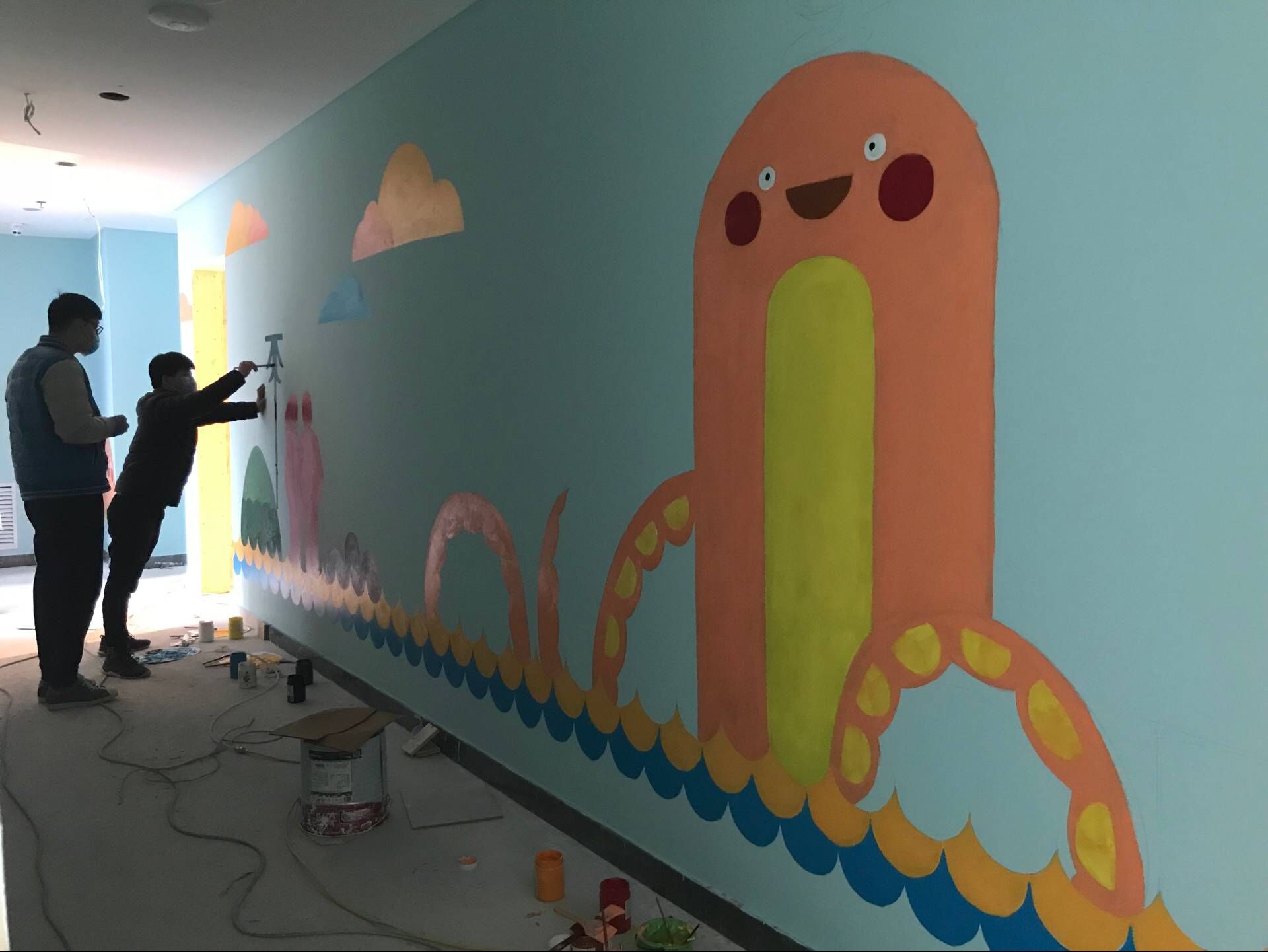 为提高自身的社会责任感和社会适应潜质。建筑工程系环境设计专业的学生于12月15日利用课余时间发挥自己的专业特长,在万科御龙山幼儿园开展了墙绘装饰活动,为孩子们提供了一个温馨、美观的日常生活、学习的环境。