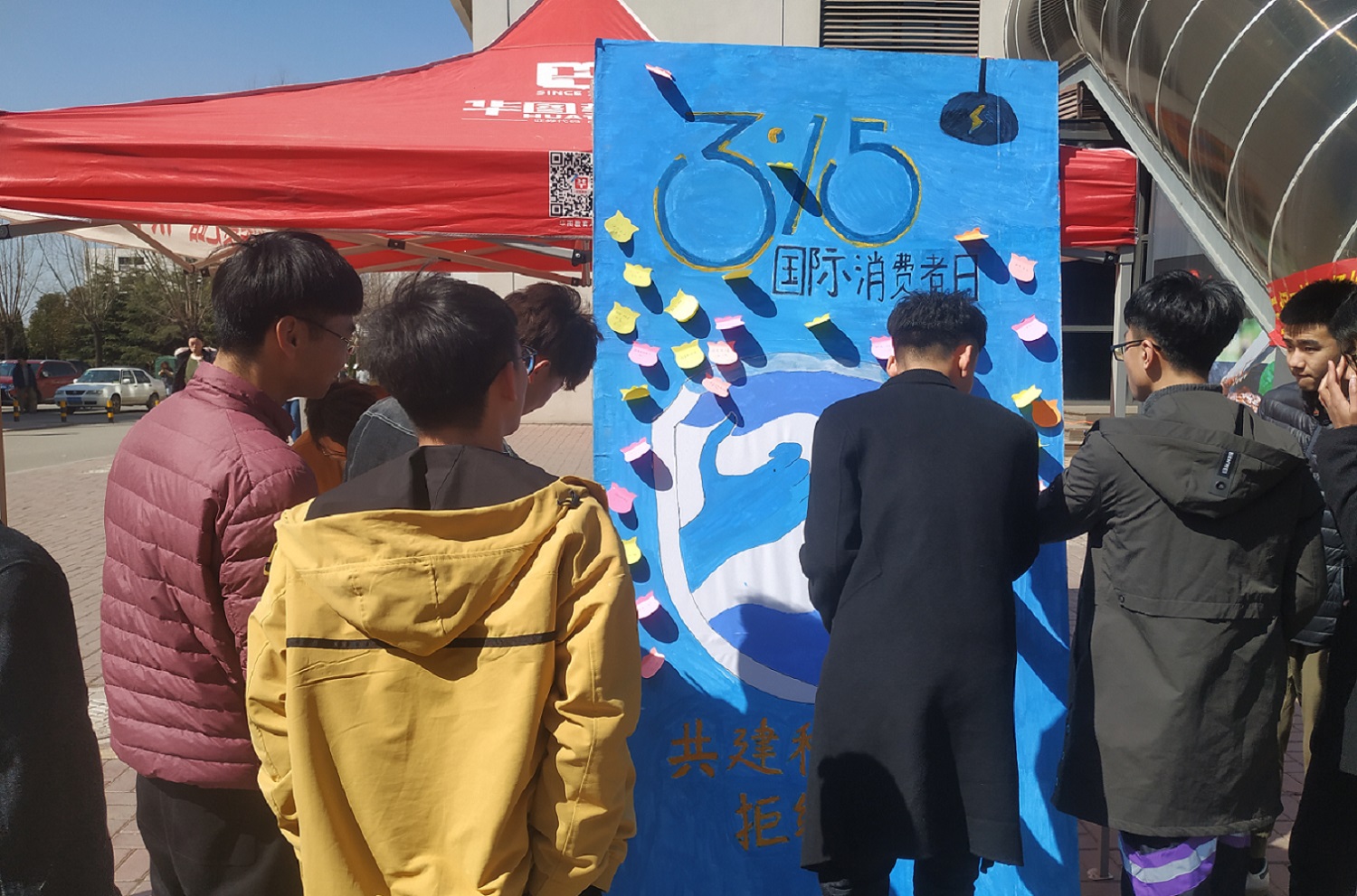 活动期间,刘春强、李亮老师及权益部工作人员为同学们作了“理性消费合理维权”大学生消费知识普及。结合真实案例介绍一些诈骗手段和方式,提醒广大同学要提高自我保护意识,并向同学们介绍了合理维权的方式和途径。活动现场设立了展板和咨询台,现场的同学在展板上写下对维权的一些看法和建议,使同学们在繁忙的学习生活的同时,也能关注身边有关消费方面的问题。