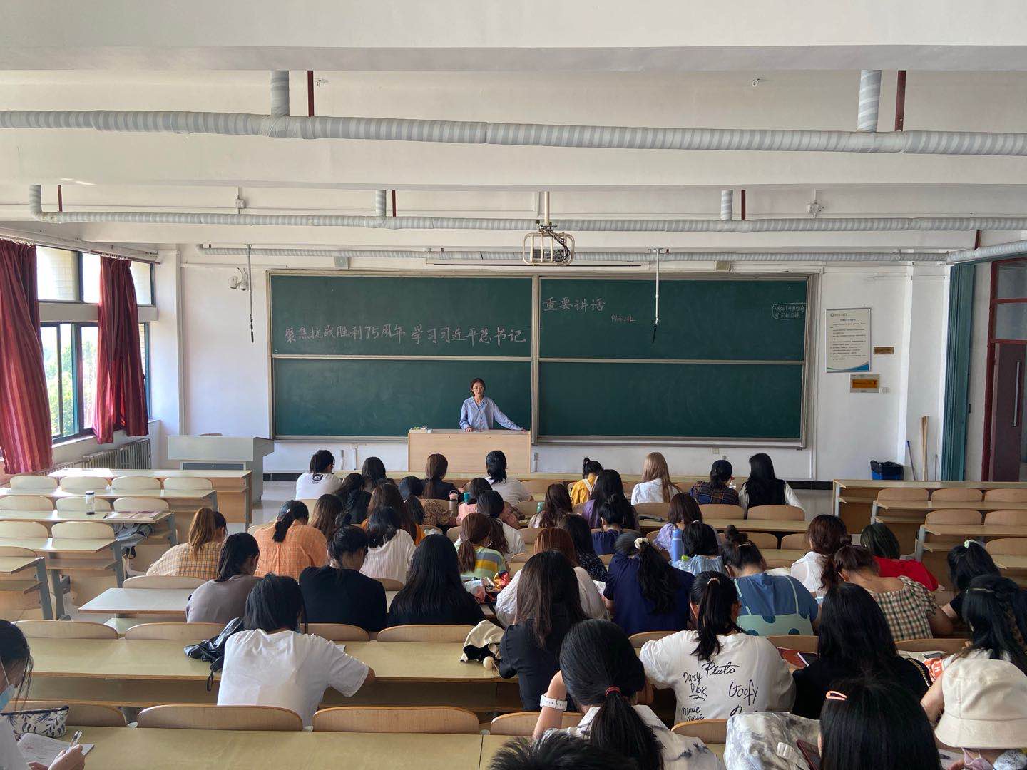 在新学期第一周,中文与法律系各团支部通过电视、网络等多媒体观看习总书记系列讲话,通过“主题微团课”、“云端思修室”微信公众号、“轮流朗读、共同探讨”等丰富多彩的形式加强思想引领和理论学习。特别是中1901-2团支部团支书张锐带领同学们利用学习强国平台对《习总书记在纪念中国人民抗日战争暨世界反法西斯战争胜利75周年座谈会上的讲话》进行学习,随后分组进行“抗战知识擂台赛”,此次活动获得了团员们的一致好评。同学们纷纷表示要牢记历史经验和教训,弘扬伟大的抗战精神,为实现中华民族的伟大复兴贡献自己的力量。