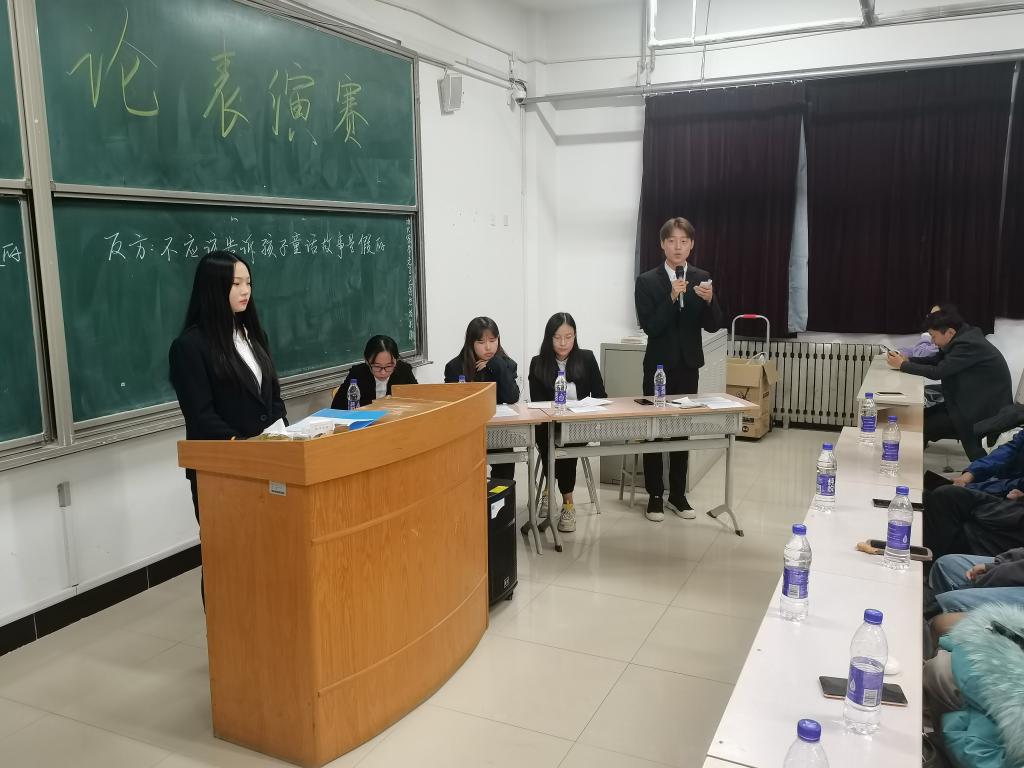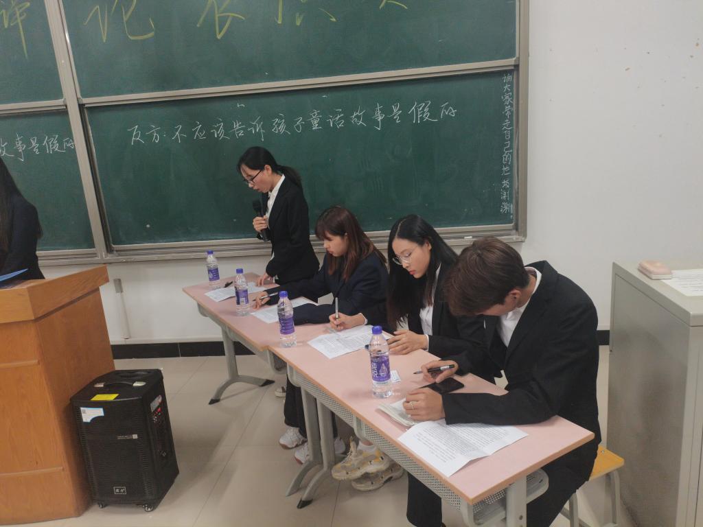 比赛开始前,主持人对食品系辩论队进行了简单介绍。随后,双方选手进场落座,进行自我介绍,表演赛也随之拉开序幕。双方辩手围绕着辩题:应不应该告诉孩子童话是假的,展开了精彩的辩论。