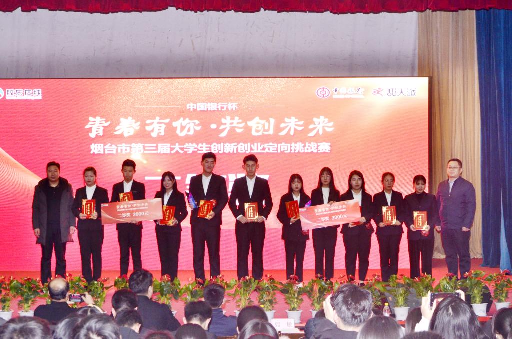 12月21日下午,中国银行杯“青春有你·共创未来”烟台市第三届大学生创新创业定向挑战赛总决赛暨颁奖典礼在我院一教多功能厅举行。共青团烟台市委副书记王杰、烟台市委网信办网络评论和网络社会工作科科长张景亮、烟台市公共就业和人才服务中心副主任刘敬涛、胶东在线网站总编辑刘镇、文经学院信息工程系副主任原帅及来自山东工商学院、鲁东大学、烟台职业学院等学校老师代表出席活动。