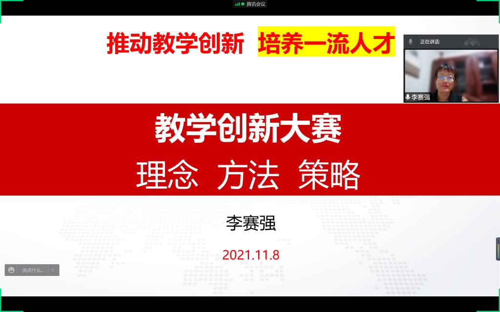 为提升教师现代信息技术与教育教学深度融合能力及教学创新能力,提高人才培养质量。我校从教师的实际需求出发,聚焦第二届全国高校教师教学创新大赛,解读大赛相关内容。11月8日,山东大学李赛强教授以“教学创新大赛理念 方法 策略”为题,与我校130余名教师进行了在线分享和交流。