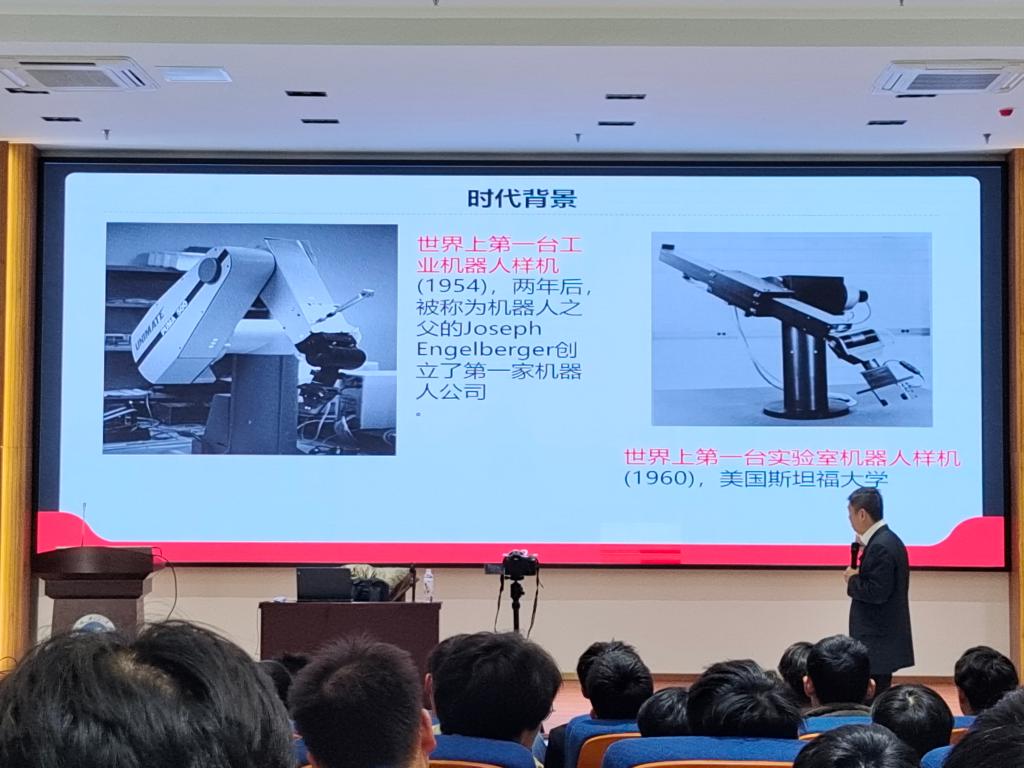 11月14日上午,机器人应用研究院执行院长胡斌博士作为主讲人在综合楼报告厅做学术报告,人工智能学院21级全体学生参加。