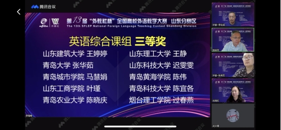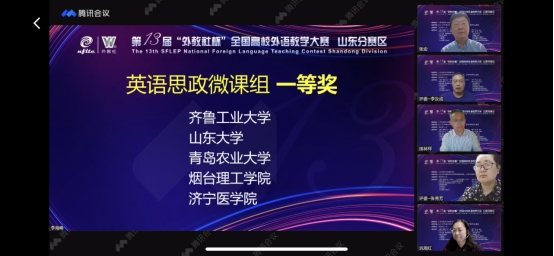 5月21日,第十三届“外教社杯”全国高校外语教学大赛山东省决赛在云端落幕。烟台理工学院参赛教师、团队在大赛四个组别的赛事中取得历史性突破,获得特等奖一项,一等奖一项,三等奖两项。我校教师徐家南荣获(视)听说课组特等奖,并将于年底作为山东省唯一代表参加该组别的全国赛;于巧丽团队荣获英语思政微课组一等奖;许月娟和过春燕分别荣获日语综合课组和英语综合课组三等奖。