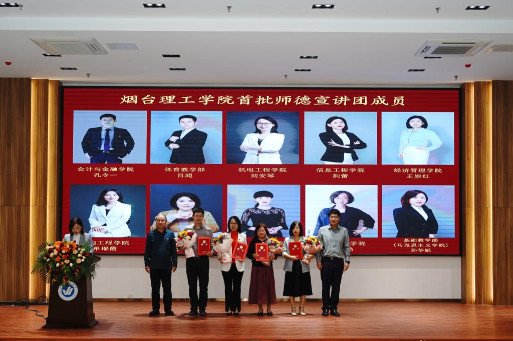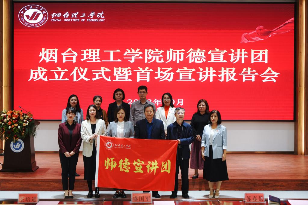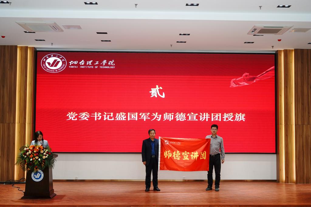 会上,副校长苏春景宣布烟台理工学院师德宣讲团成立并宣读了《烟台理工学院关于成立校级师德宣讲团的通知》。党委书记盛国军为师德宣讲团团长孔令一授旗,校领导依次为烟台理工学院首批宣讲团成员代表颁发聘书。