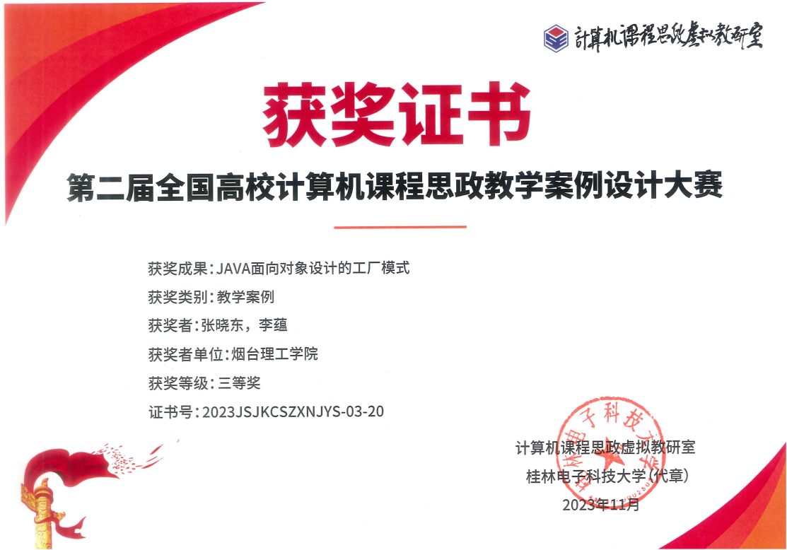 近日,由教育部计算机课程思政虚拟教研室主办,成员高校承办,相关企业协办的第二届全国高校计算机课程思政教学案例设计大赛成功举办。我校信息工程学院宫萍团队的《流水处理技术在CPU中的应用与分析》、张晓东团队《Java面向对象设计的工厂模式》的参赛案例分别荣获二等奖和三等奖。