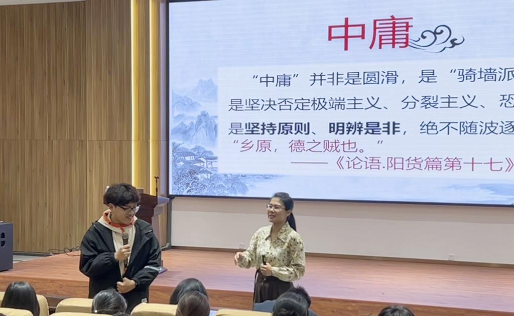 书会上,李小云老师讲述了儒家思想中的“中庸”之道,结合经典原文与现实案例,开展了修身、做人、求学、处事四个部分的讲授,李老师结合自身经历引导同学深入理解儒家思想,强调了经典阅读在塑造个人品格、提升思维深度以及增强文化素养方面的积极作用,希望能够帮助学生建立正确的人生观和价值观。李小云老师提出,在这个充满变革和挑战的时代,需师生共同努力,升级思维方式,探寻修身做人的智慧之路,为构建更加美好的社会贡献自己的力量。