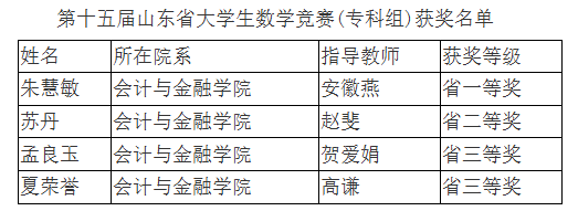 6月1日,第十五届山东省大学生数学竞赛(专科组)总决赛在潍坊职业学院落下帷幕,我校学生朱慧敏、苏丹等4名学生分别获得1个一等奖、1个二等奖、2个三等奖的好成绩。