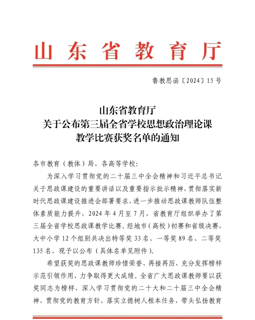 近日,山东省教育厅公布了“第三届全省学校思想政治理论课教学比赛”获奖名单,我校徐贝贝老师获得了《马克思主义基本原理》组二等奖。