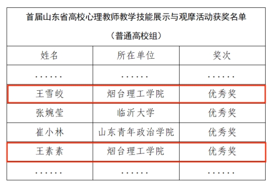 近日,由山东省大学生心理健康教育专业委员会组织举办的“首届山东省高校心理教师教学技能展示与观摩活动”落下帷幕,经过激烈角逐,我校大学生心理健康教育指导中心王素素、王雪皎两位老师双双荣获普通高校组优秀奖。