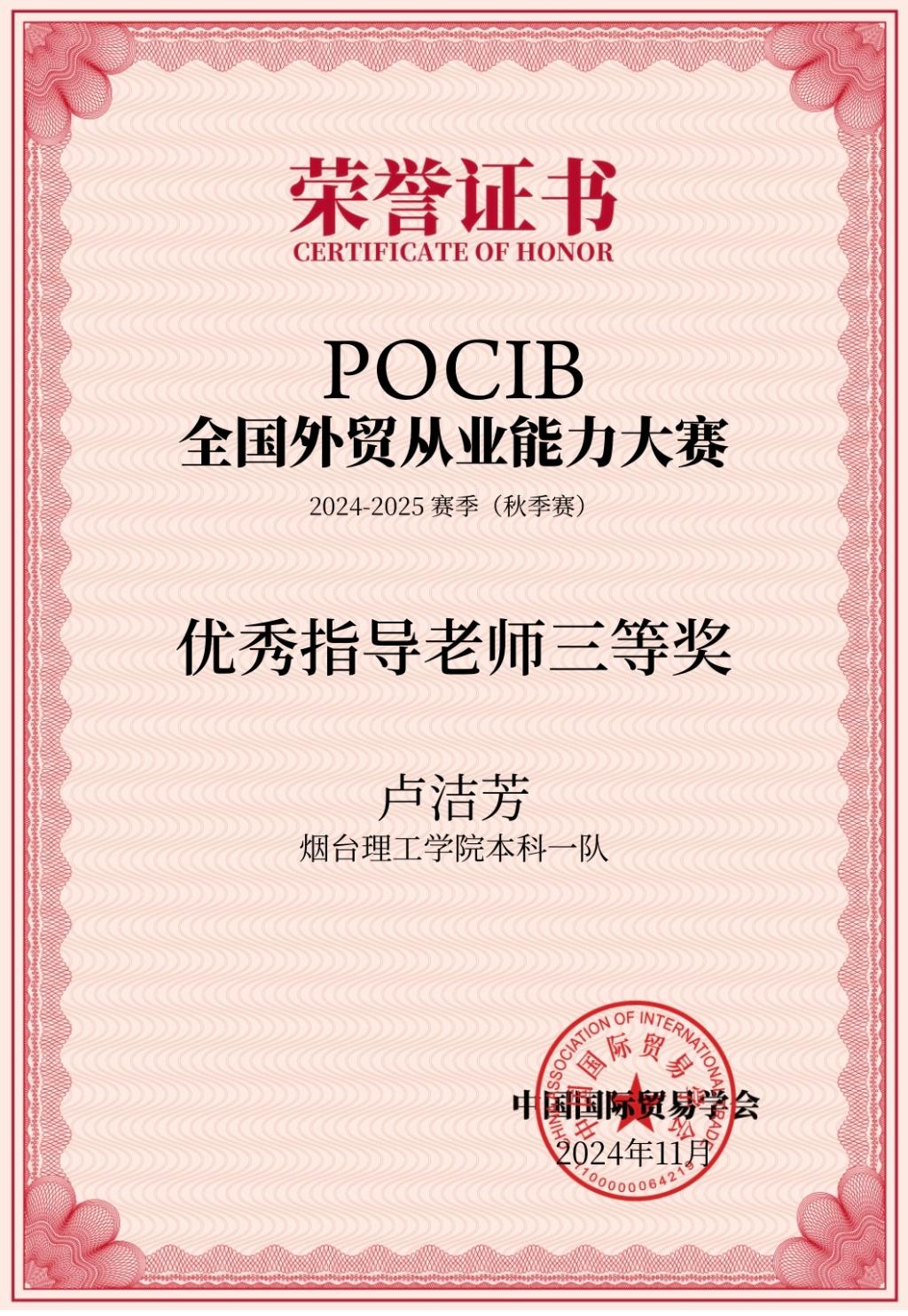 近日,由中国国际贸易学会主办,中国国际贸易学会培训处和南京世格软件有限责任公司承办的第十四届POCIB全国外贸从业能力大赛(2024-2025赛季秋季赛)落下帷幕。经过激烈角逐,由我校外国语学院李金红、卢洁芳老师指导的烟台理工学院本科一队(参赛学生:高红红、黑月宝、苗田雨、孙忠玲、王婕、吴真真、徐子媛、张强、赵文娜、赵雯丽)荣获本科组团体三等奖。