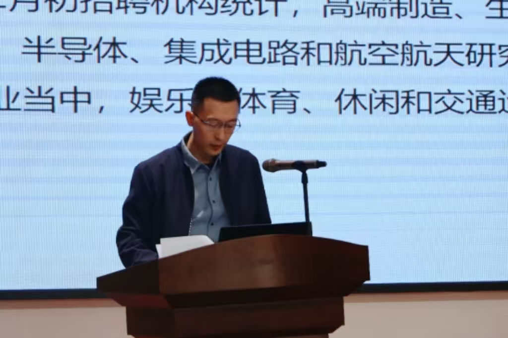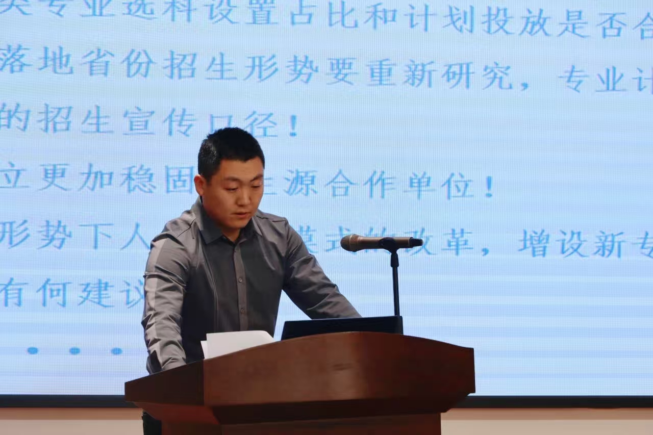 与会人员共同观看了我校2024年度招生就业创业工作总结回顾视频。经济管理学院党总支书记邓之增、机电工程学院党总支副书记王晓黎、外国语学院党总支副书记赵蓓作了交流发言;招生办公室主任胡成、就业指导中心主任刘超作2025年招生就业形势分析及重点工作解读。