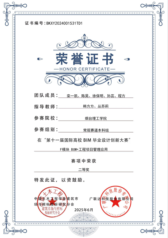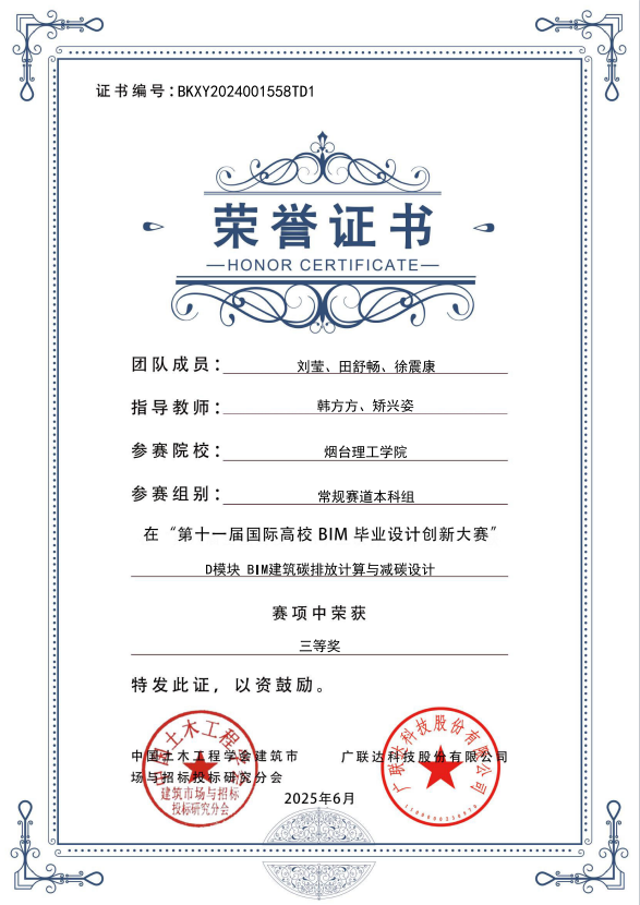 近日,第十一届国际高校BIM毕业设计创新大赛圆满收官。本次大赛吸引了全国700余家国内院校,10余家国外院校,14000余支团队,参与师生80000余人,共计提交作品4400余份,规模空前。韩方方、丛苏莉、矫兴姿、赵彦娟四位老师带队参赛,历时5个多月,最终选拔参赛的3支队伍脱颖而出,荣获国家级一等奖1项、二等奖1项、三等奖1项,取得突破性成绩。