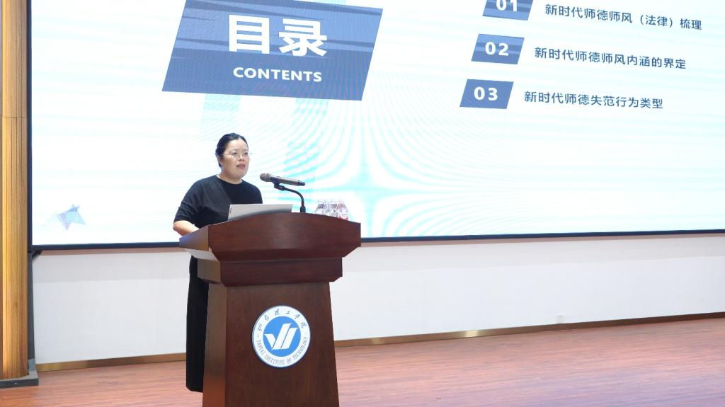 党委宣传部、教师工作部副部长赵蓓以《师德警示教育》为主题作了报告。她强调了教育家精神弘扬践行的重要性,表示师德师风建设必须常抓不懈才能推动广大教师为高校教育事业的发展贡献自己的力量,创造美好的教育未来。