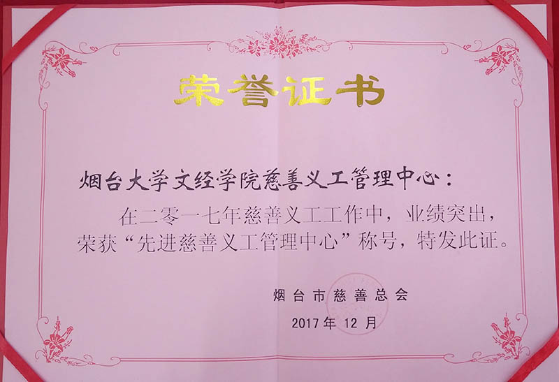 在12月5日国际义工日之际,烟台市慈善总会召开了2017年纪念“国际义工日”暨义工晋星表彰大会,对80个优秀义工组织、3466名晋星义工进行表彰。我院慈善义工管理中心获“先进慈善义工管理中心”称号。