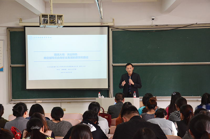 讲座围绕“理论思考”“实践探索”“基地建设”三个板块展开论述。在“理论思考”板块,申钊主任介绍了辅导员职业的演变,明确了新形势下辅导员工作面临的新挑战,引发大家对多样化社会思潮、市场逐利、传统教育引导方式和网络新媒体等诸多挑战的新思考。他在解读新版“教育部43号令”时认为,新形势下辅导员的目标更加明确、身份更加清晰、工作职责更加丰富、职业发展更加宽广;在“实践探索”板块,申主任引入山东建筑大学“伺拽克”棒垒球队7年奋进终登2017第十三届全国大学生棒垒球总决赛冠军奖台和“农村经纪人”创业团队受到新闻联播和央视媒体的重点报道两个实例,让大家深刻感受到坚持和信仰的力量,懂得做学生工作需要选准方向、扎根基层,方能让学生学以致用的道理;“基地建设”板块中,申钊主任介绍了山东高校辅导员基地在扶植全省辅导员走向职业化和专业化道路上所做的努力和取得的成绩,并表示将继续加大力度扶持高校辅导员成长发展,大家备受鼓舞,受益匪浅。