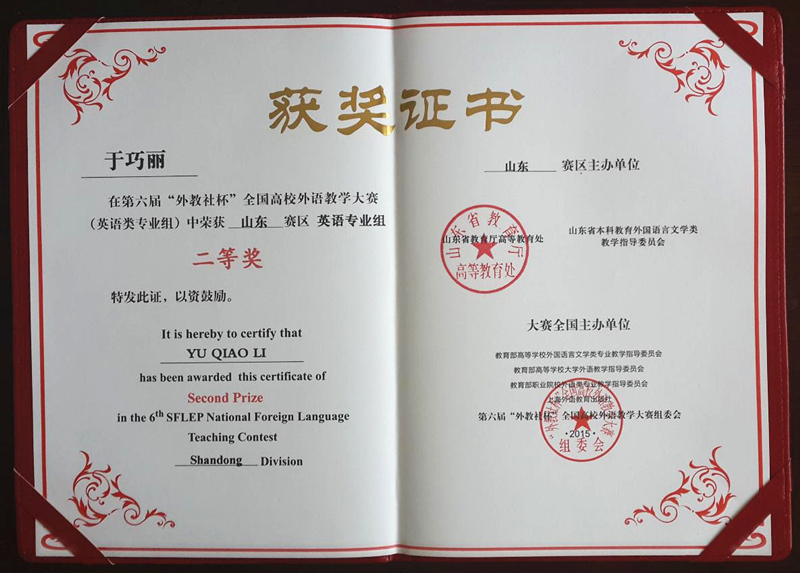 第六届“外教社杯”全国外语教学大赛(英语类专业组)山东赛区复赛、决赛于5月23-24日在山东理工大学举行,我院参赛选手于巧丽老师荣获二等奖。