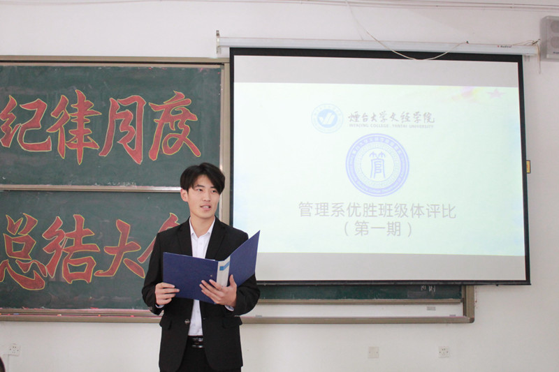 为提高学生学习积极性,严格作风纪律,鼓励学生强健身体,发扬党风建设。11月8日中午,管理系于一教119教室举行纪律月度总结大会。由管理系学生会主席魏朋虎、副主席陈帅康,学习部部长赵长斌、体育部部长张磊以及自律部部长马勇参加。