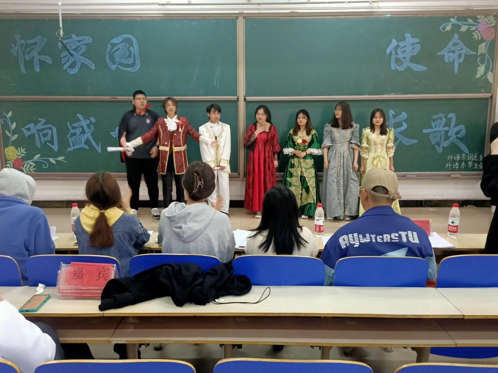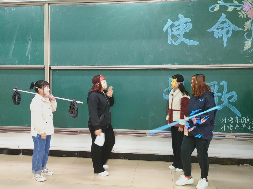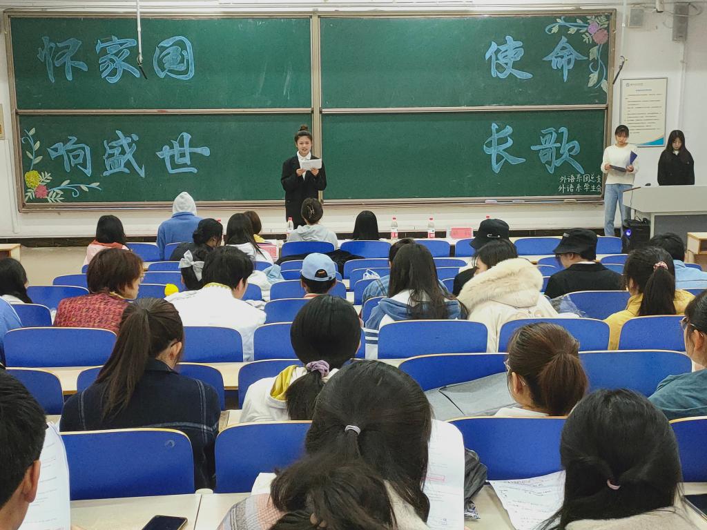 为了活跃校园文化氛围,展现当代大学生积极健康的风貌,同时提高外语系学子的综合素质和艺术修养,丰富课余文化生活,外语系于3月27日在一教101展开以“怀家国使命 响盛世长歌”为主题的话剧比赛。