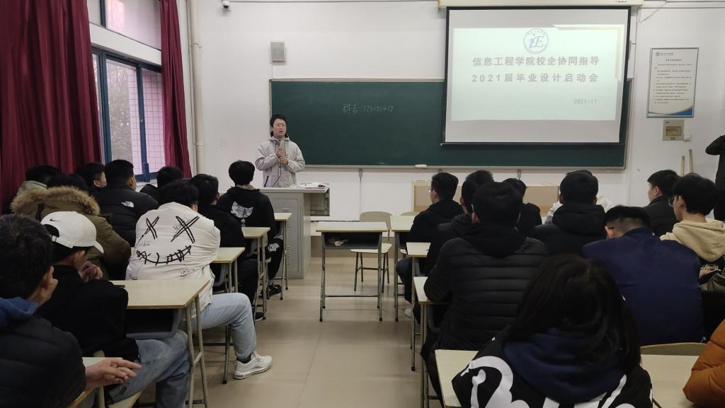 为保证2022届校企协同指导毕业设计工作顺利进行,11月15日下午,信息工程学院于一教215召开校企协同指导2022届毕业设计启动会。会议由学院副院长原帅老师主持,四家企业负责人以及40余名2022届毕业生参加本次会议,会议就如何协同指导毕业设计进行了交流,全体与会人员有信心圆满完成本届毕业设计工作。