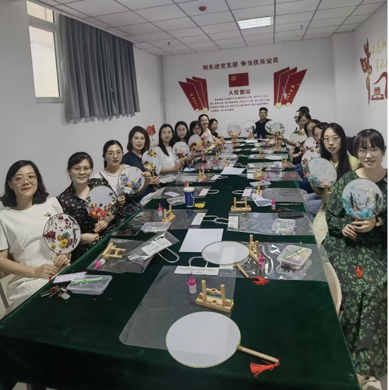 工会主席张爱娜老师向全体教师详细介绍团扇的结构、制作流程及所需材料,并通过精美的成品展示,让大家生动形象地领略了团扇的魅力。大家在老师的指导下,挑选自己喜欢的干花进行装饰,通过折、扭转固定、定型将不同种类的干花呈现出自己喜欢的模样。制作过程中,各位老师充分发挥各自的想象力,用胶水将一束束美丽的干花固定在团扇上,把团扇设计、制作成属于自己独一无二的艺术品。一把把精巧的团扇呈现在大家眼前,老师们用自己灵巧的双手呈现了一场视觉盛宴。最后,老师们手持团扇拍照留念,留下属于自己的美好回忆。