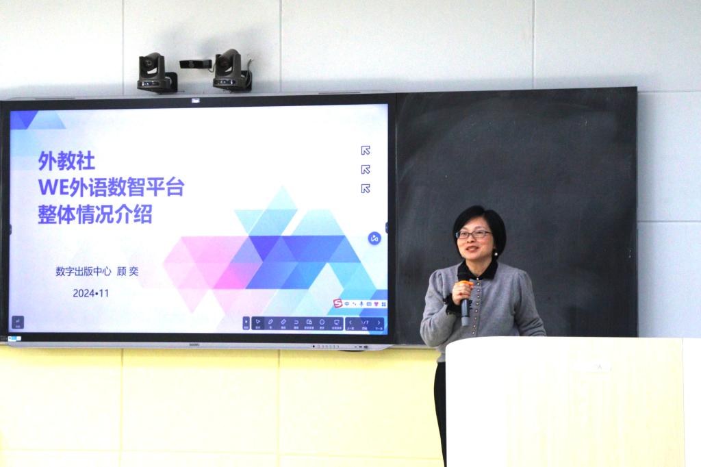 为加快推进外语教育数字化转型,深化“智能+”教育改革,促进外语教科研深度融合,11月28日下午,外国语学院携手上海外语教育出版社在我校综合楼智慧教室开展“烟台理工学院-外教社数智平台应用及多语种语料库培训会”。本次培训会特邀外教社数字出版中心主任顾奕,总监徐青,外教社山东教育发展中心副主任武文博,高级技术顾问张晨阳莅临指导,外国语学院常务副院长于巧丽,院长助理张丽及全体教师参加了本次培训会。