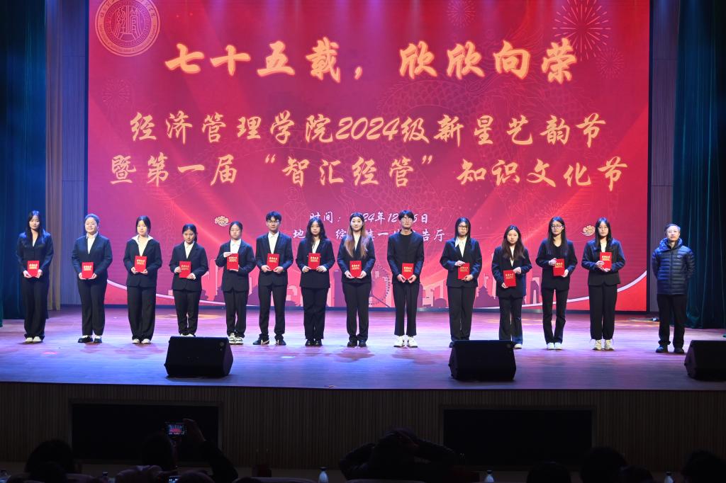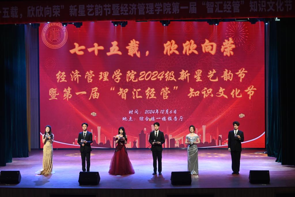 12月6日,经济管理学院于综合楼一楼报告厅盛大举行“七十五载,欣欣向荣”新星艺韵节暨第一届 “智汇经管” 知识文化节。副校长苏春景,校团委副书记臧延云,招生就业处副处长褚亮辉,文法学院党总支书记曹钊庆,食品与生物工程学院党总支副书记温少斐,国际教育学院党支部书记于丽方,经济管理学院院长华吉鹏,党总支书记邓之增,副院长殷晓彦、王崇红及经济管理学院全体老师出席活动,共同见证这场文化与知识交融的盛宴。