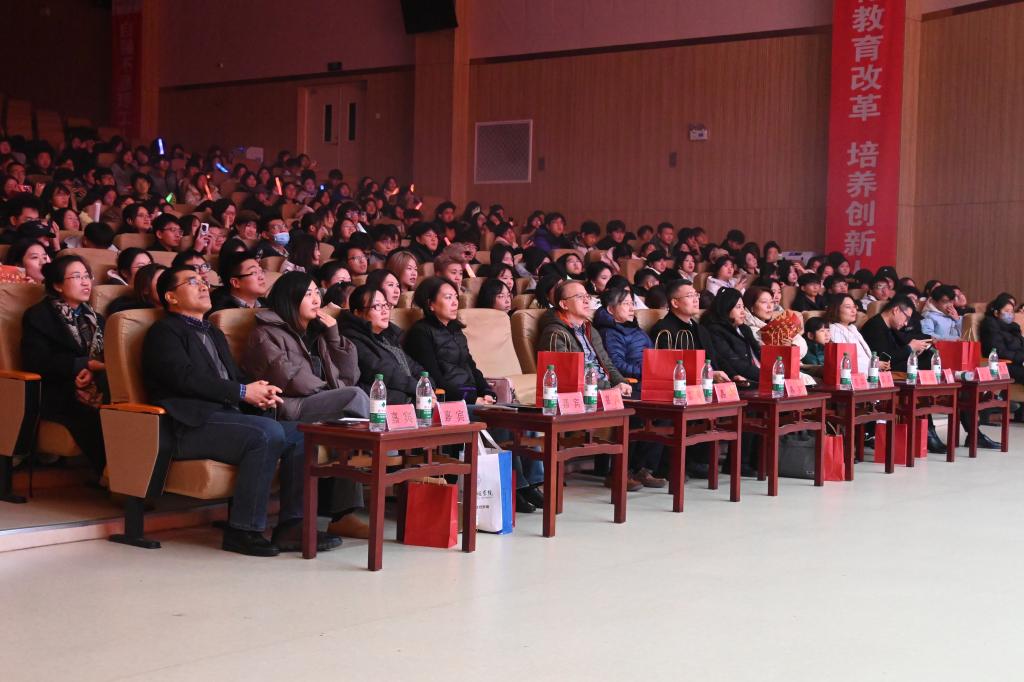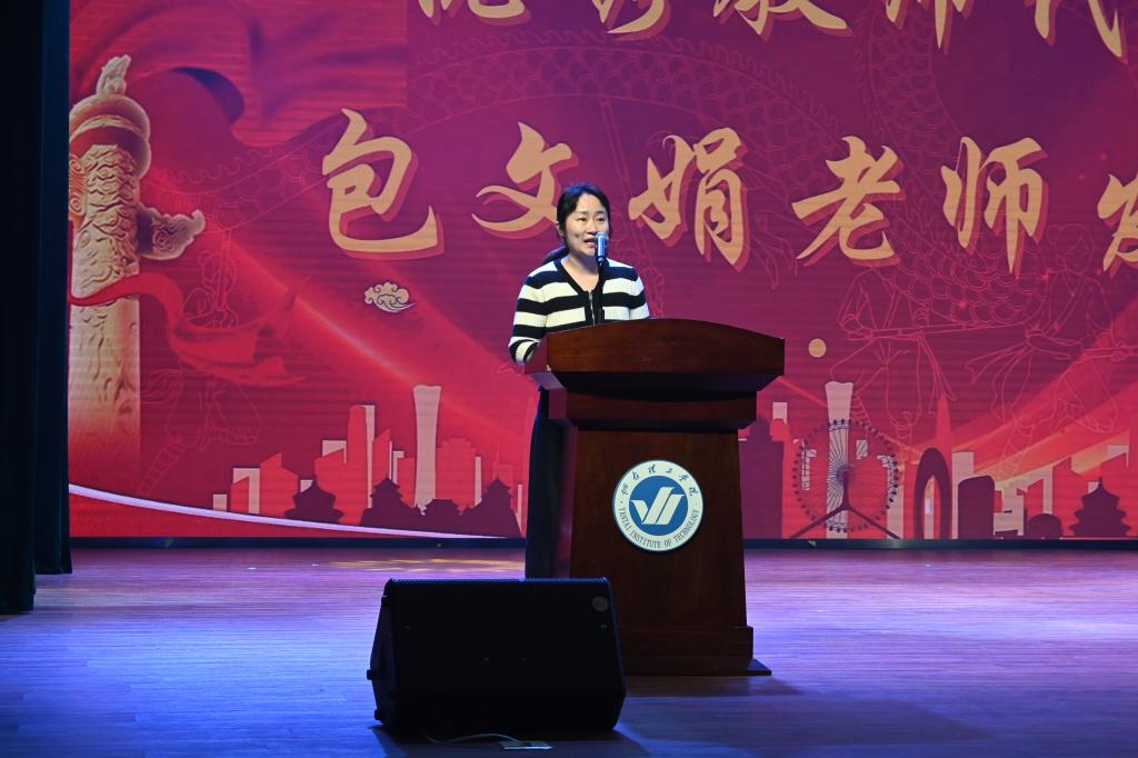 优秀教师代表包文娟老师登台发言。她分享了教学与科研的宝贵心得,强调学院对学生成长的支持,鼓励大家勇于探索、创新与实践,在学术、艺术与社会活动里全面提升自我,赢得台下热烈掌声与深度共鸣。