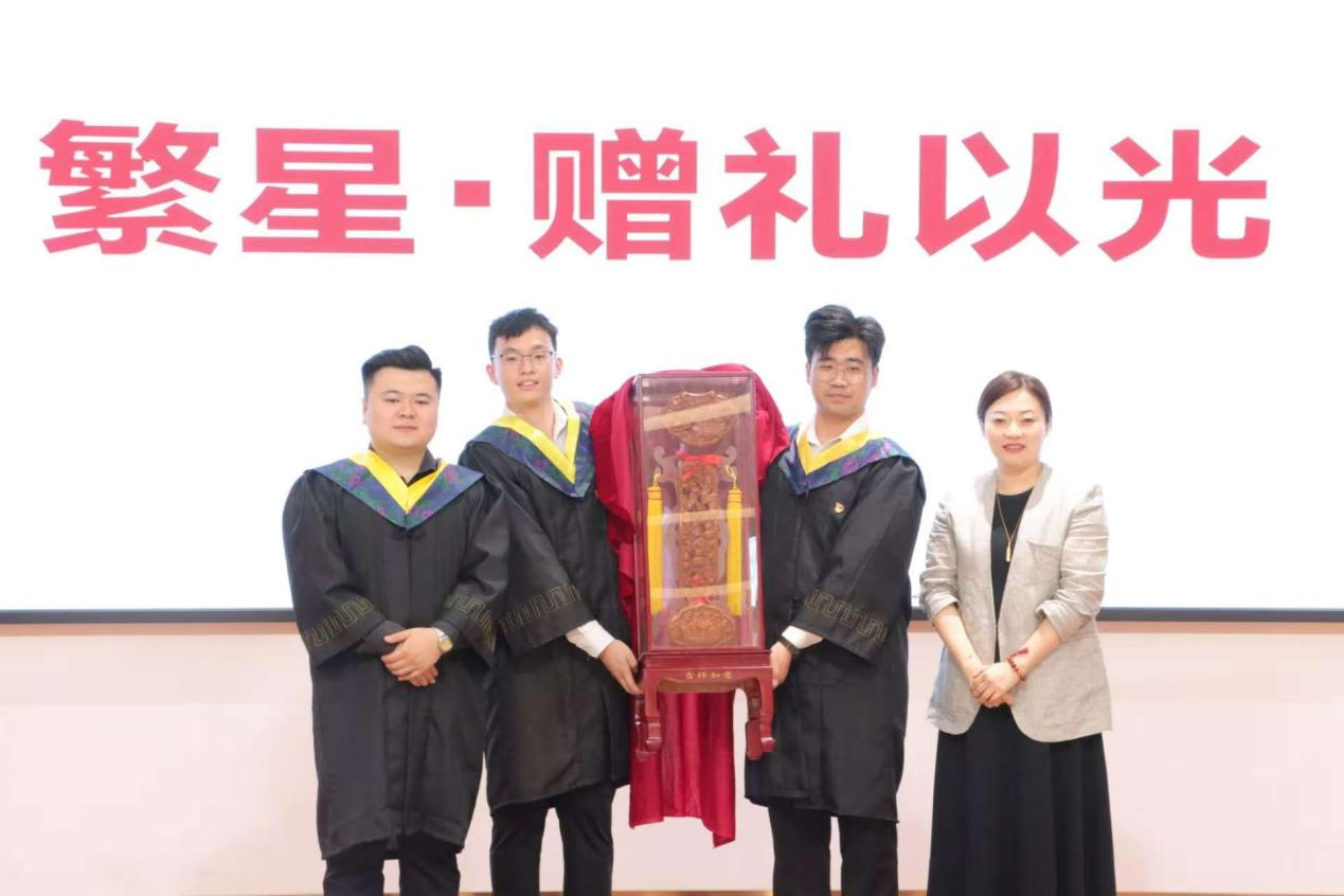 毕业生代表向母校献上精心准备的纪念礼物——镌刻着“匠心筑梦,机电长青”的如意雕塑,象征着机电学子对学院精神的传承与对未来的期许。校长助理李洁与毕业生代表共同为礼物揭幕,她动情致谢:“这份礼物是感恩,更是鞭策,定将珍藏这份心意,与学子同心同行,共赴卓越!”。
